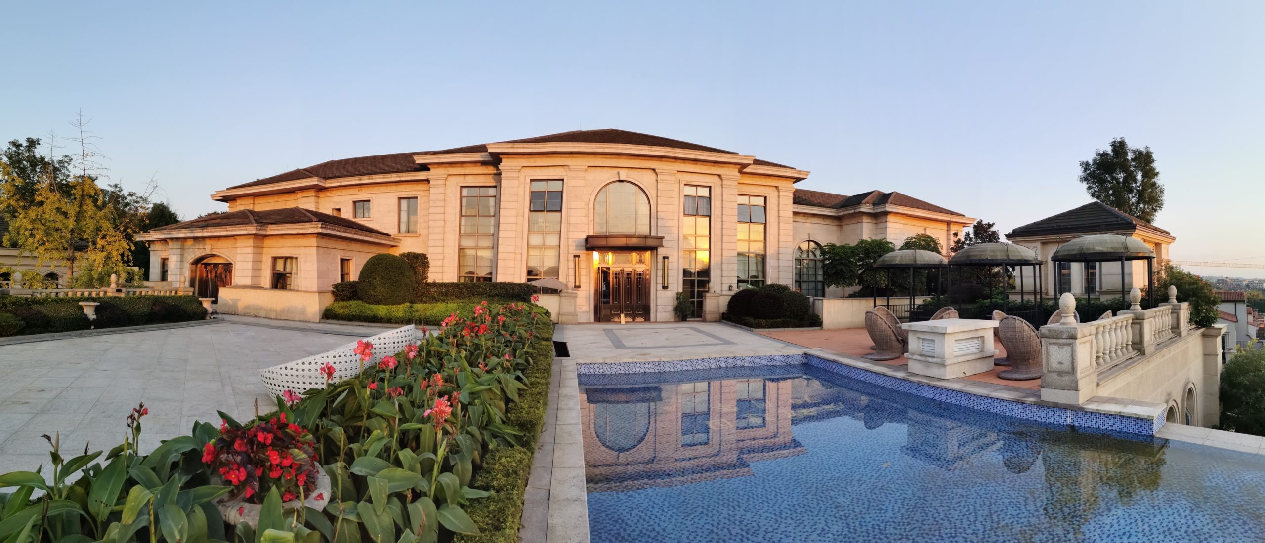 It includes a total area of 293,400m² and the green surrounding area is 105,000². A total of 573 sets. There is a total of 84 villas, which are mainly high-end single-family villas and townhouses. The project is provided by Poly Property Development Co., Ltd., Xinjin Branch. The property is settled at the highest point of Muma Mountain, with an Italian Tuscan style and European town characteristics.